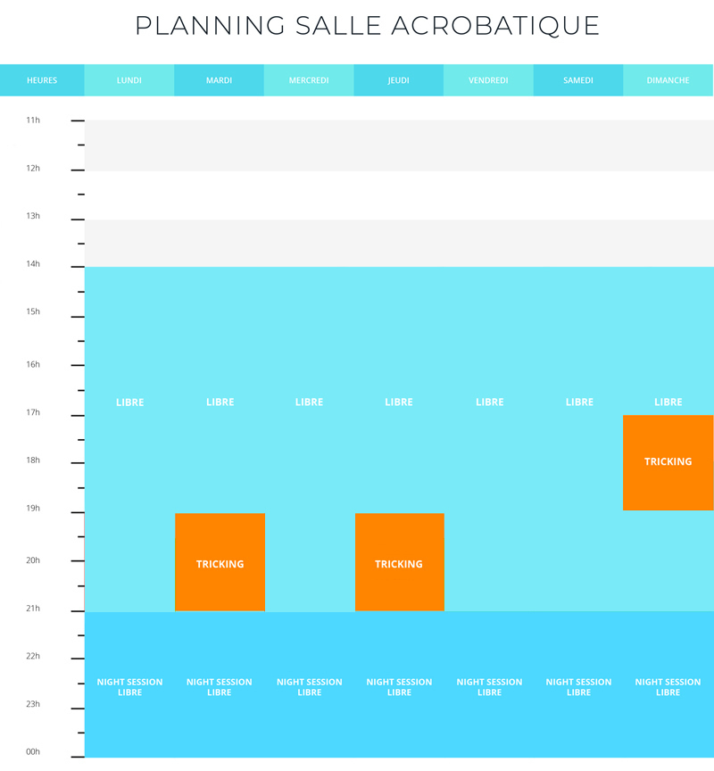 Adultes : mardi et jeudi de 19h à 21h, dimanche de 17h à 19h