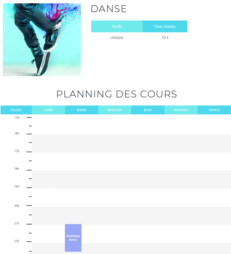 Danse classique, House, Contemporain, Breakdance, Hip Hop, Popping, Dancehall, Girly, Afrobeats, Jazz, Barre au sol, Krump, Djamboola fitness, Danse africaine (afro), Cheerleading, Capoeira